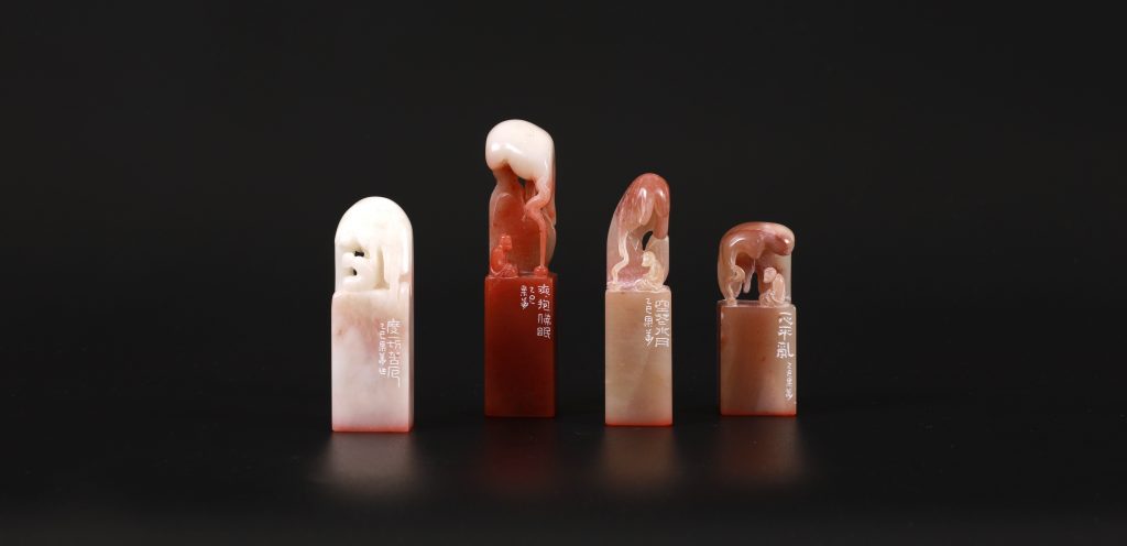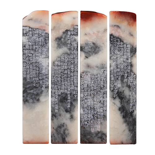 印石,本蘊含來自大地之美質與能量;篆刻,更以精雕細琢在方寸間傳達情意。此展特選數方大型印石,紋路色澤如雲似霧,將心經、大悲咒、無相頌等刻於邊款,彷彿經文在雲天裏護佑眾生;印面上諸多吉祥語句,亦蘊含滿滿祝福。