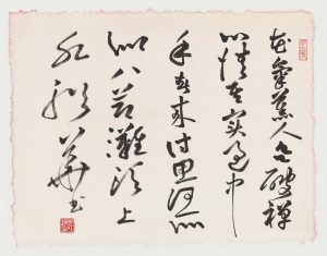 一、動盈卷軸、奔蛇走虺勢入座。驟雨旋風聲滿堂。初疑輕煙澹古松。又似山開萬仞峰。二、寒猿飲水撼枯藤。壯士拔山伸勁鐵。粉壁長廊數十間,興來小豁胸中氣。忽然絕叫三五聲。滿壁縱橫千萬字。三、馳毫驟墨列奔駟。滿座失聲看不及。筆下唯看激電流。字成只畏盤龍走。心手相師勢轉奇。志在新奇無定則。古瘦灕驪半無墨。四、醉來信手兩三行。醒後却書書不得。遠錫無前侶。孤雲寄太虛。狂來輕世界。醉裡得真如。